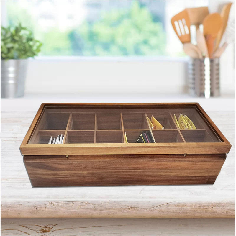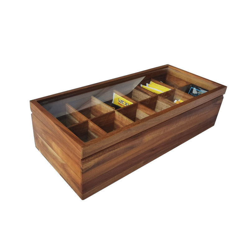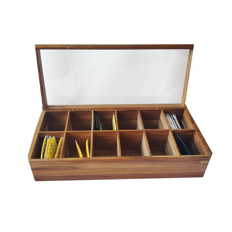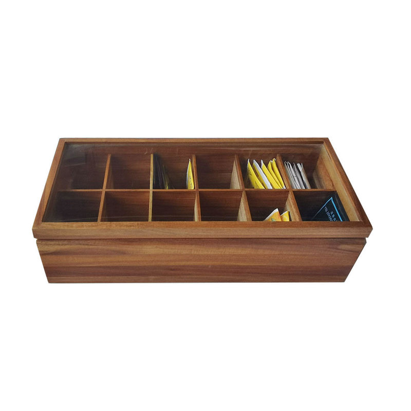 Regelbare Vlakke Borst 12 Compartimenten Filed Stevige Houten de Opslagorganisator With Glass Lid van Organisatortea bag box